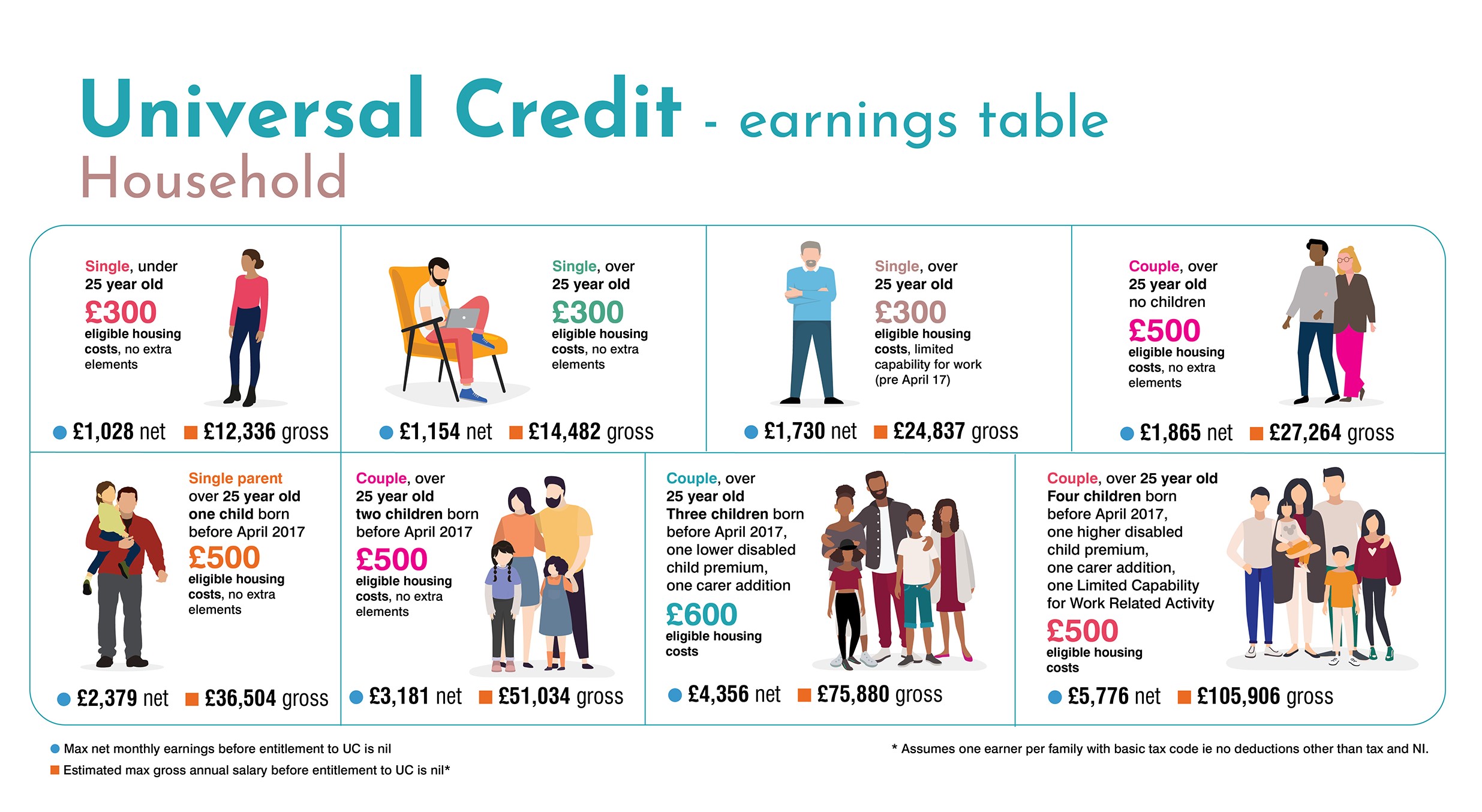 If you are working and not in receipt of any Universal Credit, but are unsure if you would qualify, the table below gives a few examples of different family circumstances and the levels at which you would still qualify for Universal Credit: